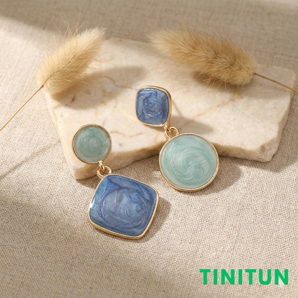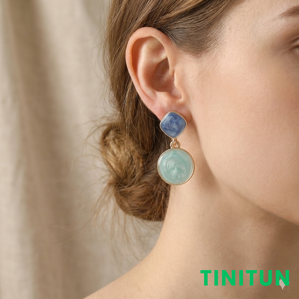 Оригінальні сережки, що поєднують форми квадрата та кола з емалевим покриттям морських кольорів.