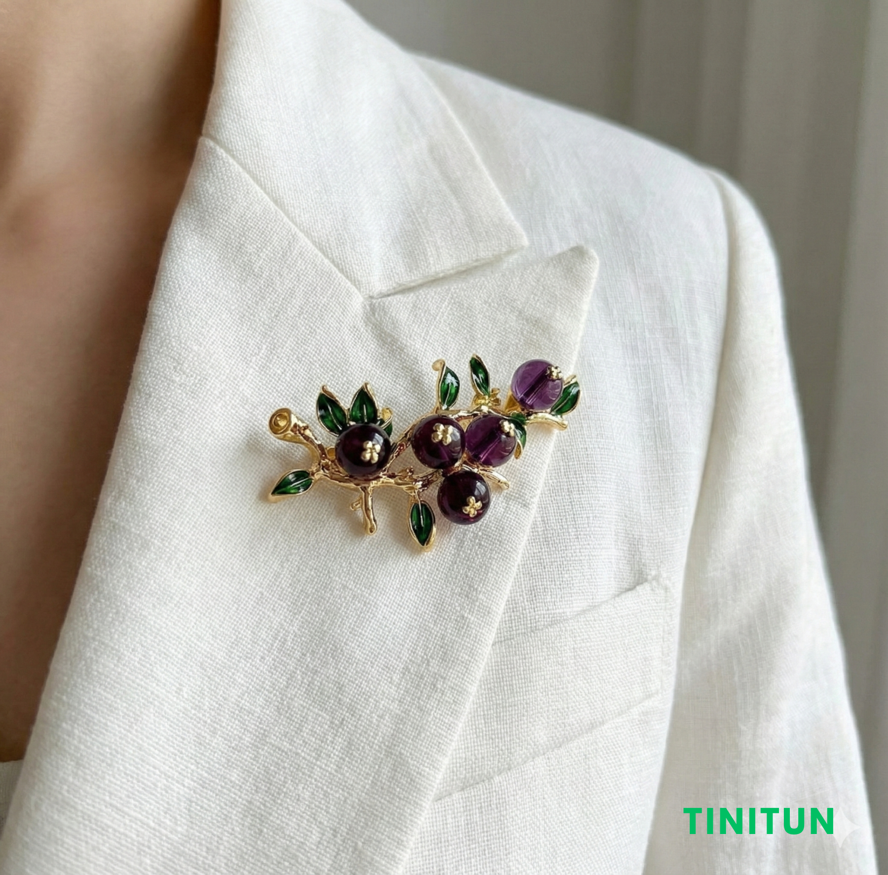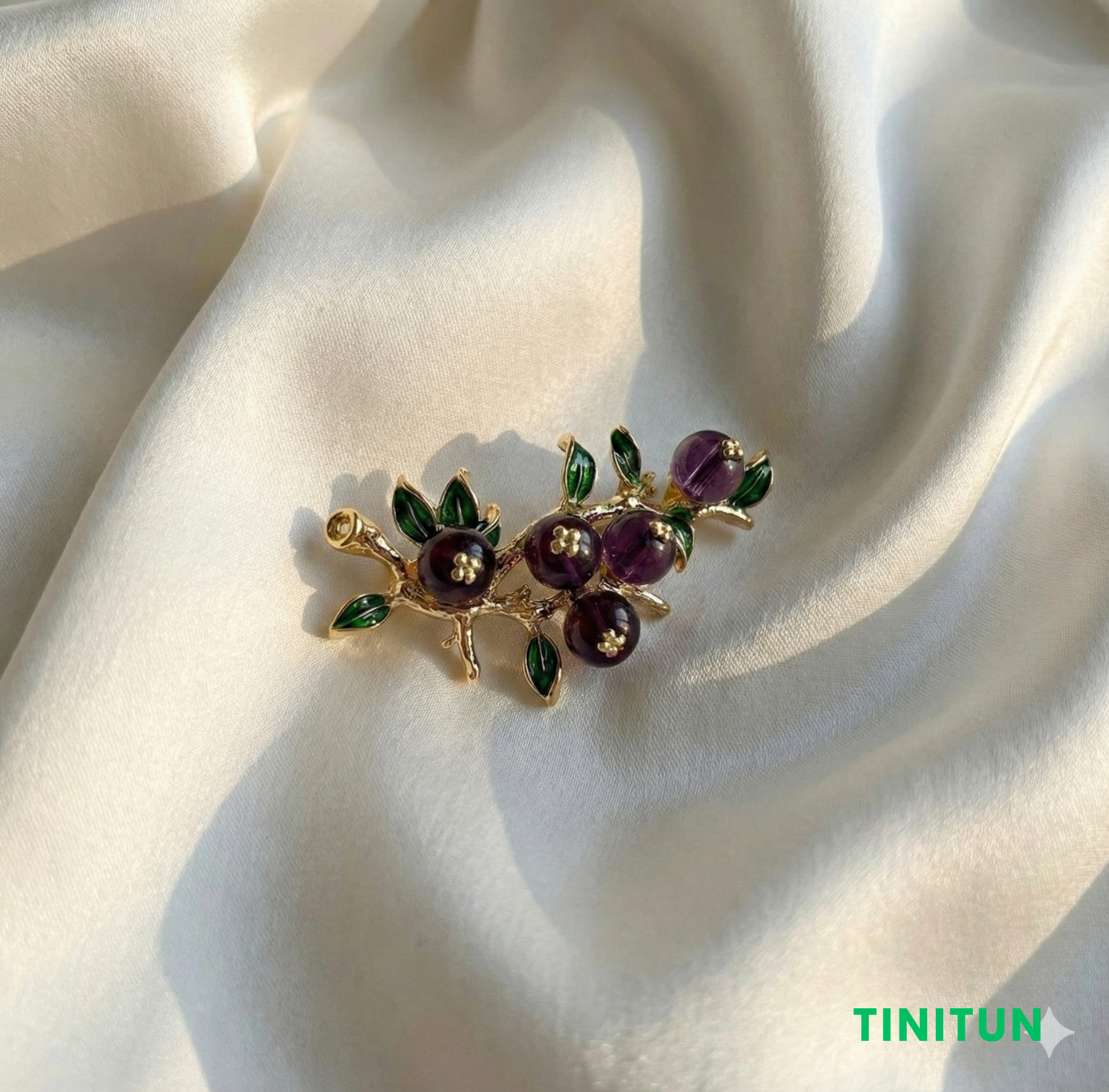 Вишукана брошка у вигляді гілочки з соковитими фіолетовими ягодами.