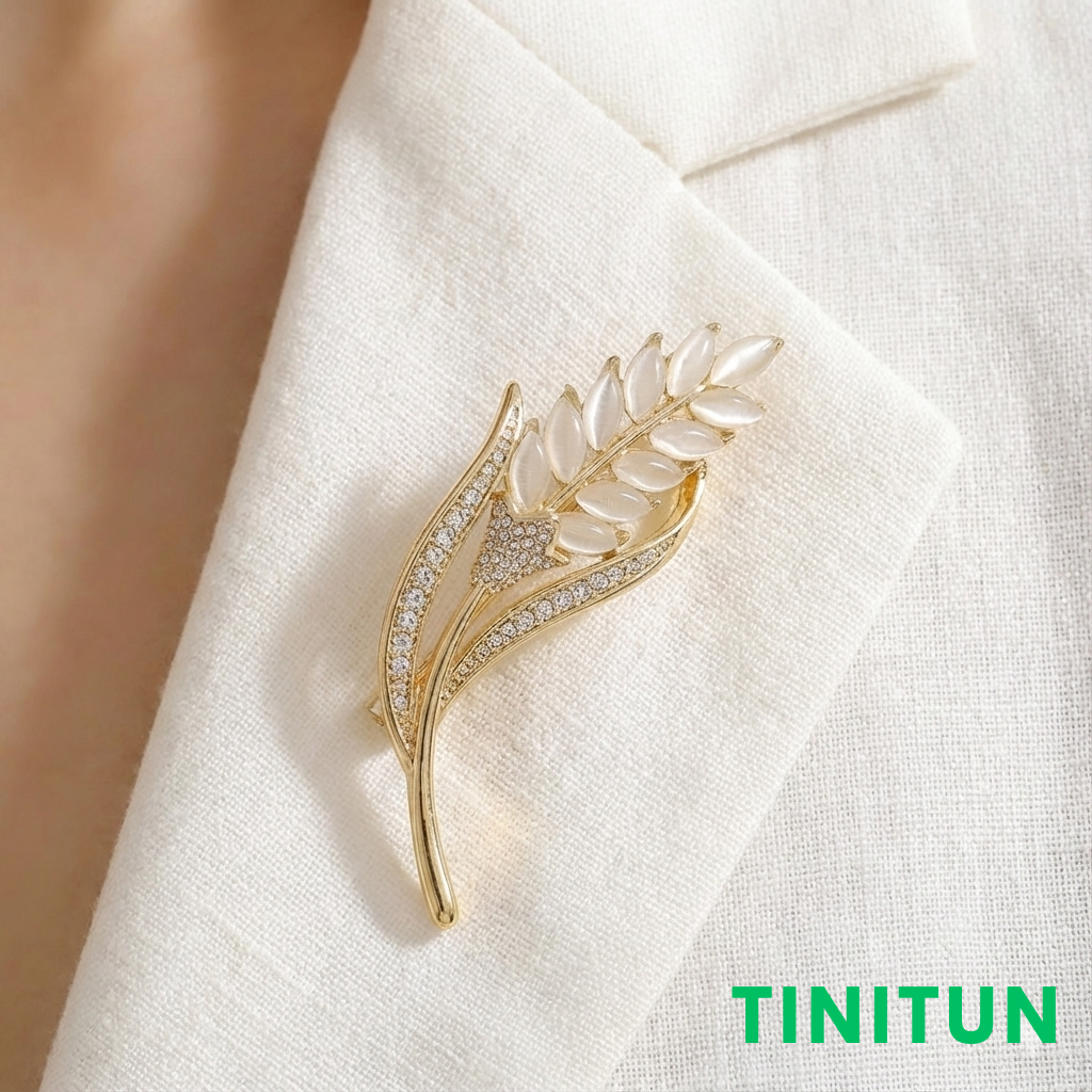 Золотистий колосок пшениці, де зернятка виконані з гладкого каменю з ефектом «котяче око», а листя прикрашене розсипом прозорих кристалів.