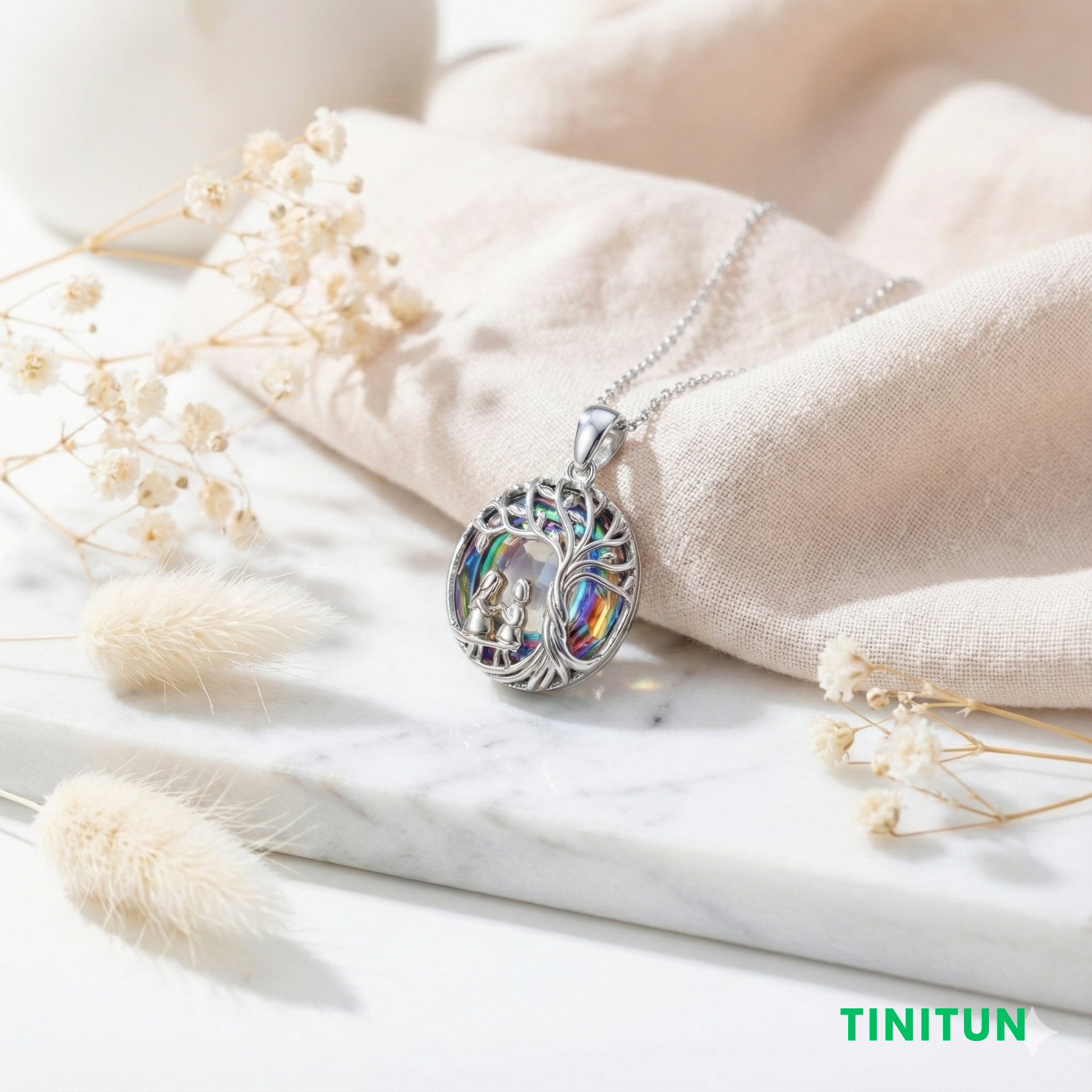 Сріблясте «Дерево Життя», під яким на гойдалці сидять дві фігурки, на фоні сяючих різнокольорових кристалів.