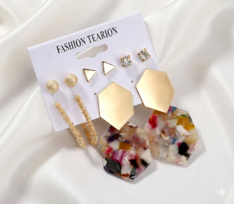 Включає класичні гвоздики, стильні золотисті фігури та акцентні сережки з кольоровим візерунком.