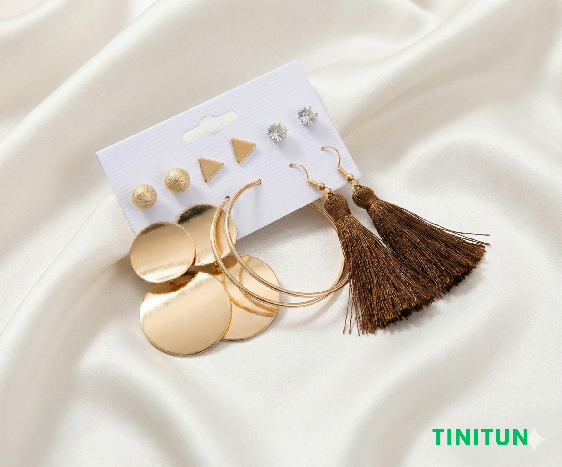 Включає трендові кільця-конго, довгі сережки з коричневими китицями та стильні диски-монетки.
