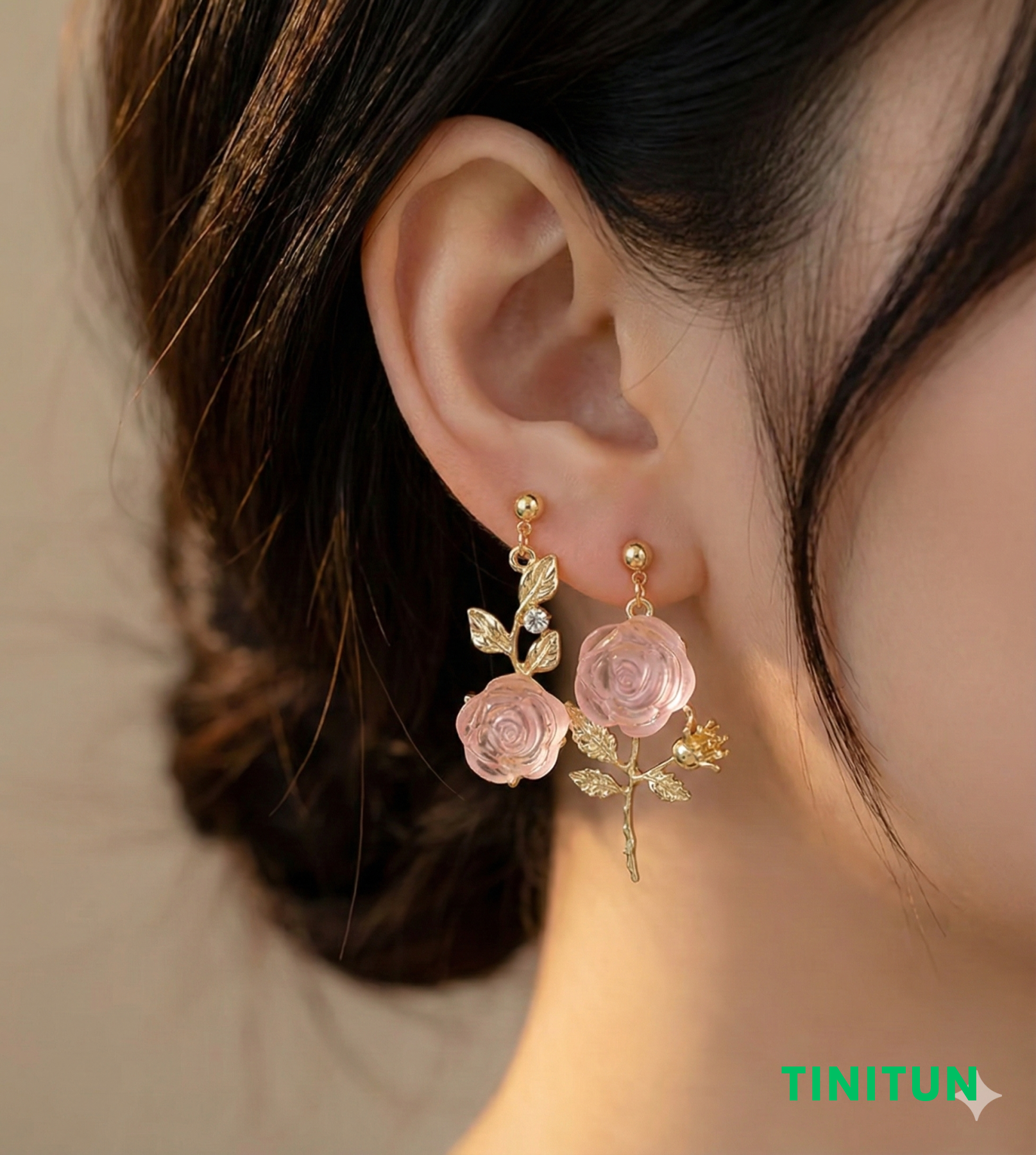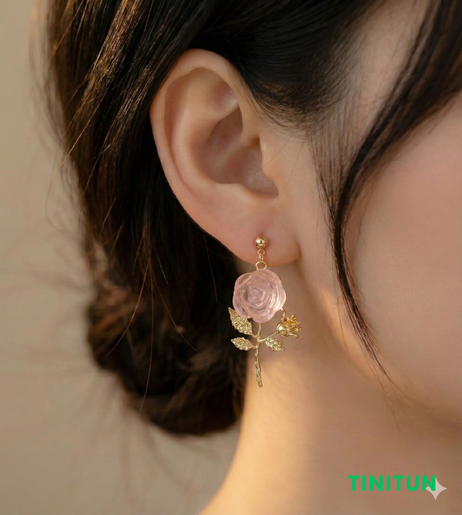 Права сережка: Лаконічний пусет у вигляді ніжного рожевого бутона, що розпустився.