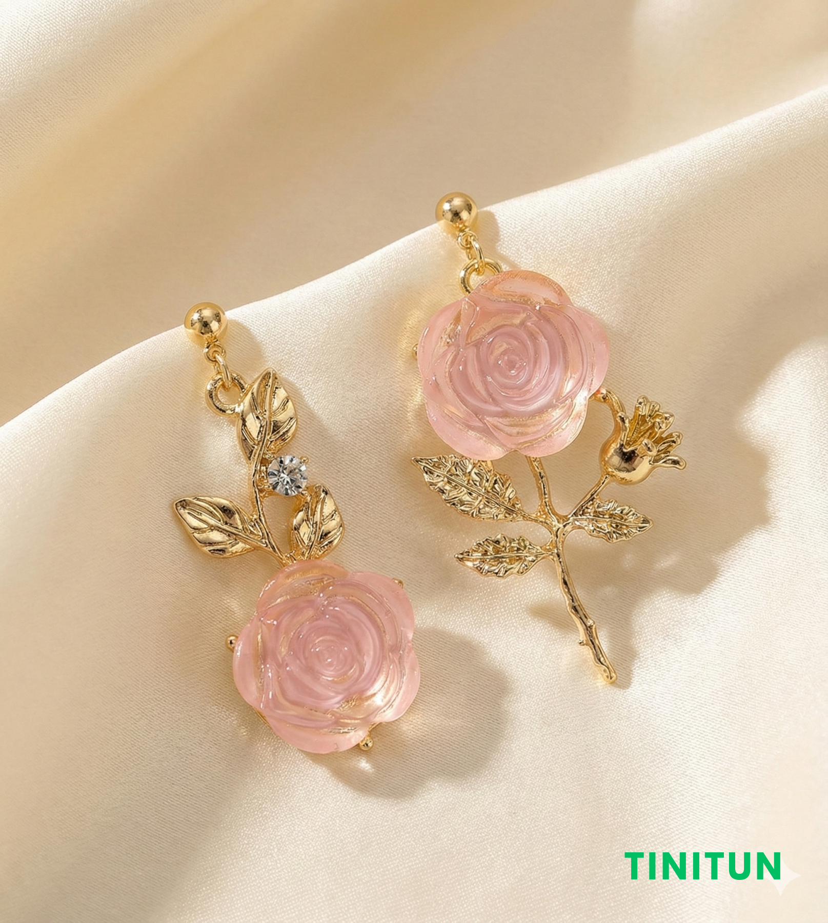 Одна сережка виконана як лаконічний пусет-квітка, інша — як витончена троянда на золотому стеблі з листочками.