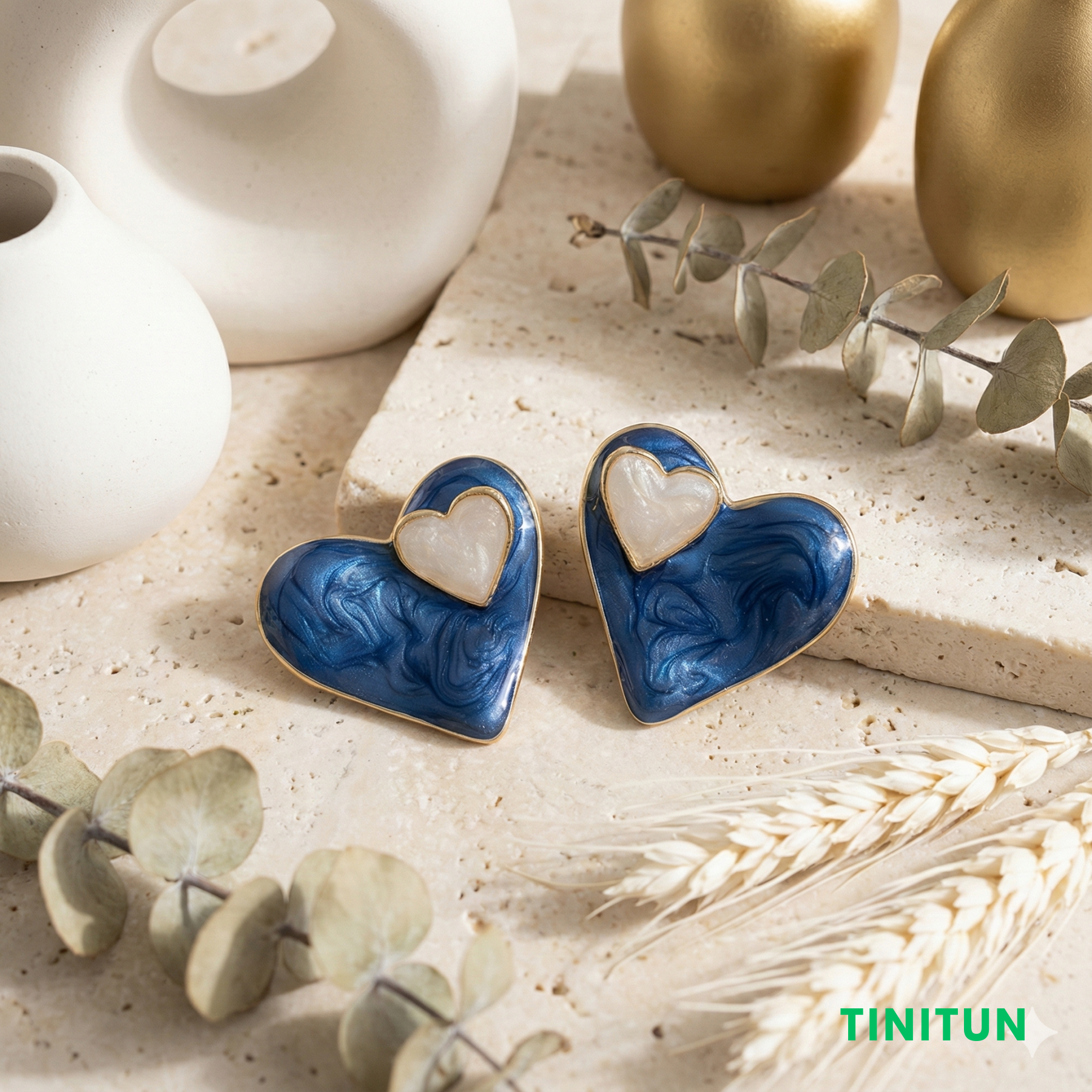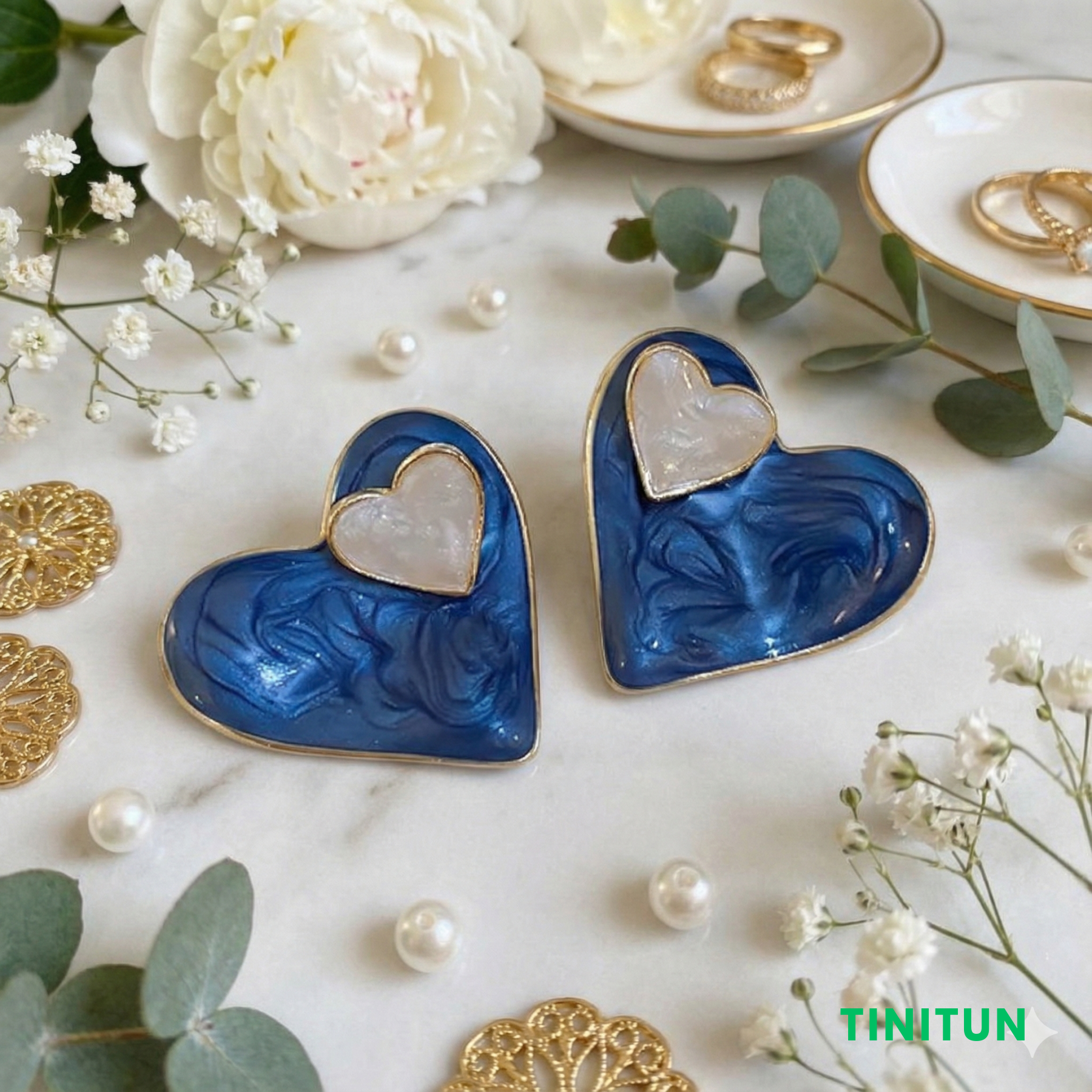 Сережки виконані у вигляді двох поєднаних сердець: велике синє з ефектом морських хвиль та маленьке перламутрово-біле.