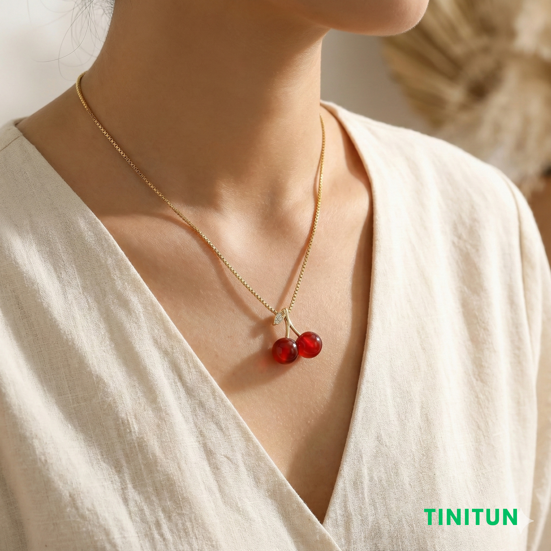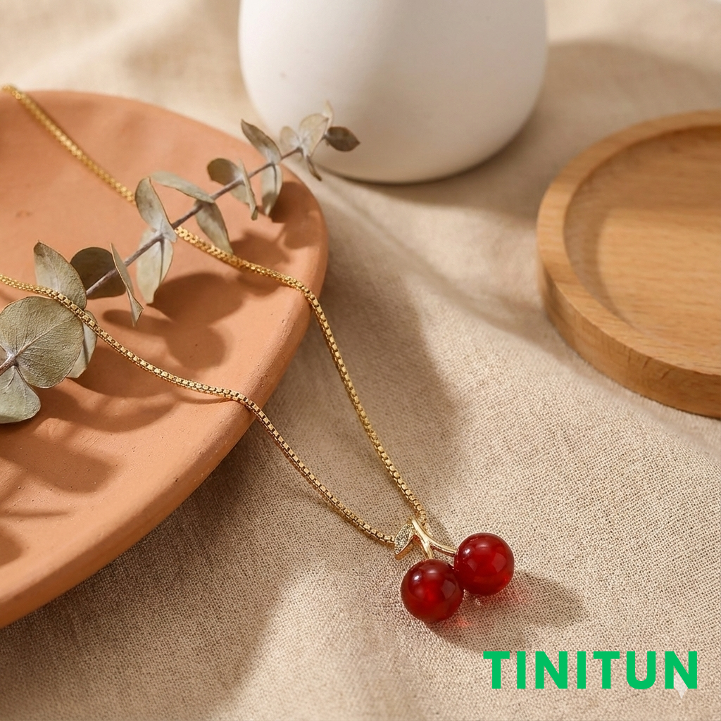Підвіска у вигляді соковитих червоних вишень на золотистому ланцюжку, прикрашена сяючими мікро-кристалами на листочку.