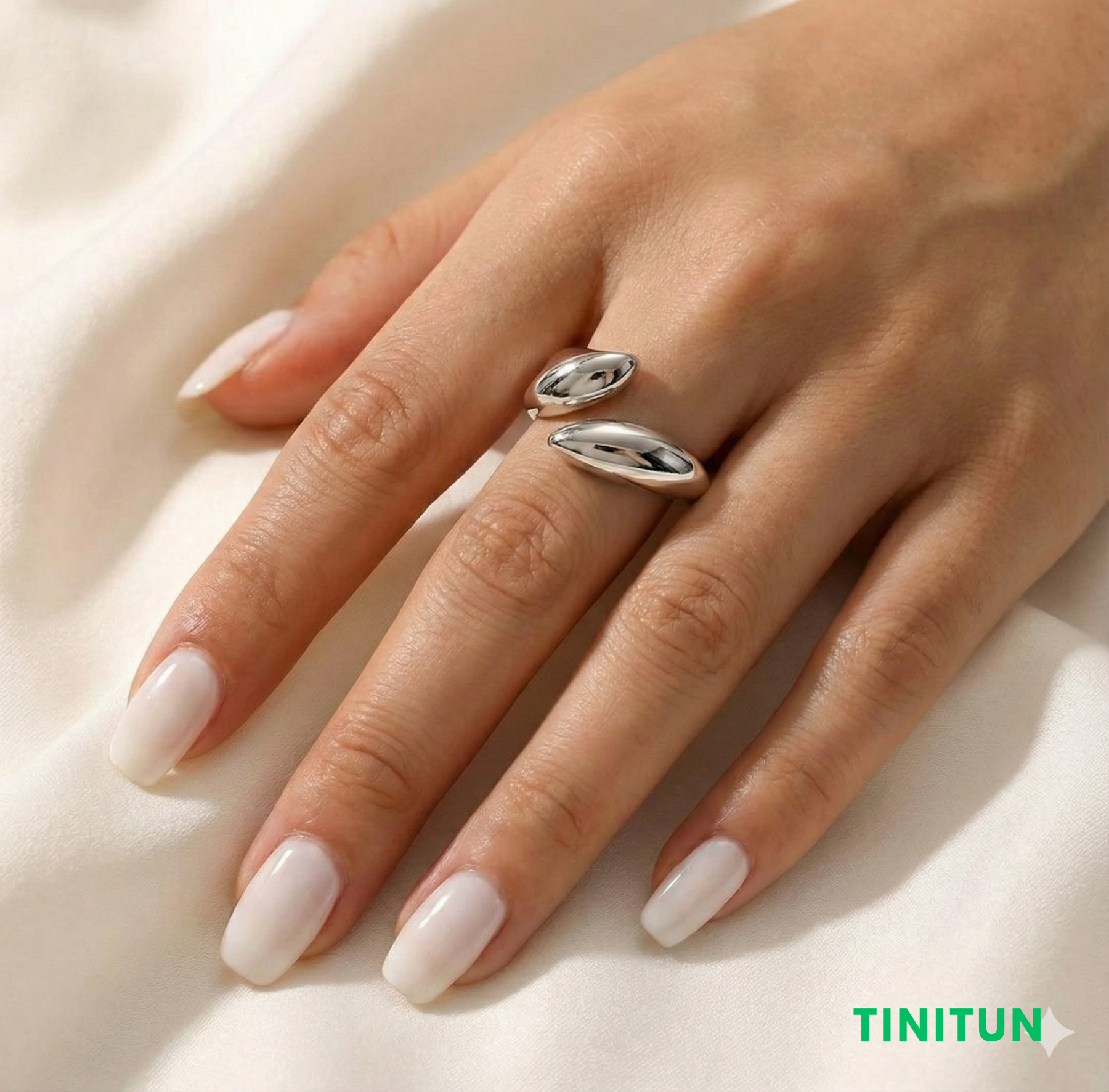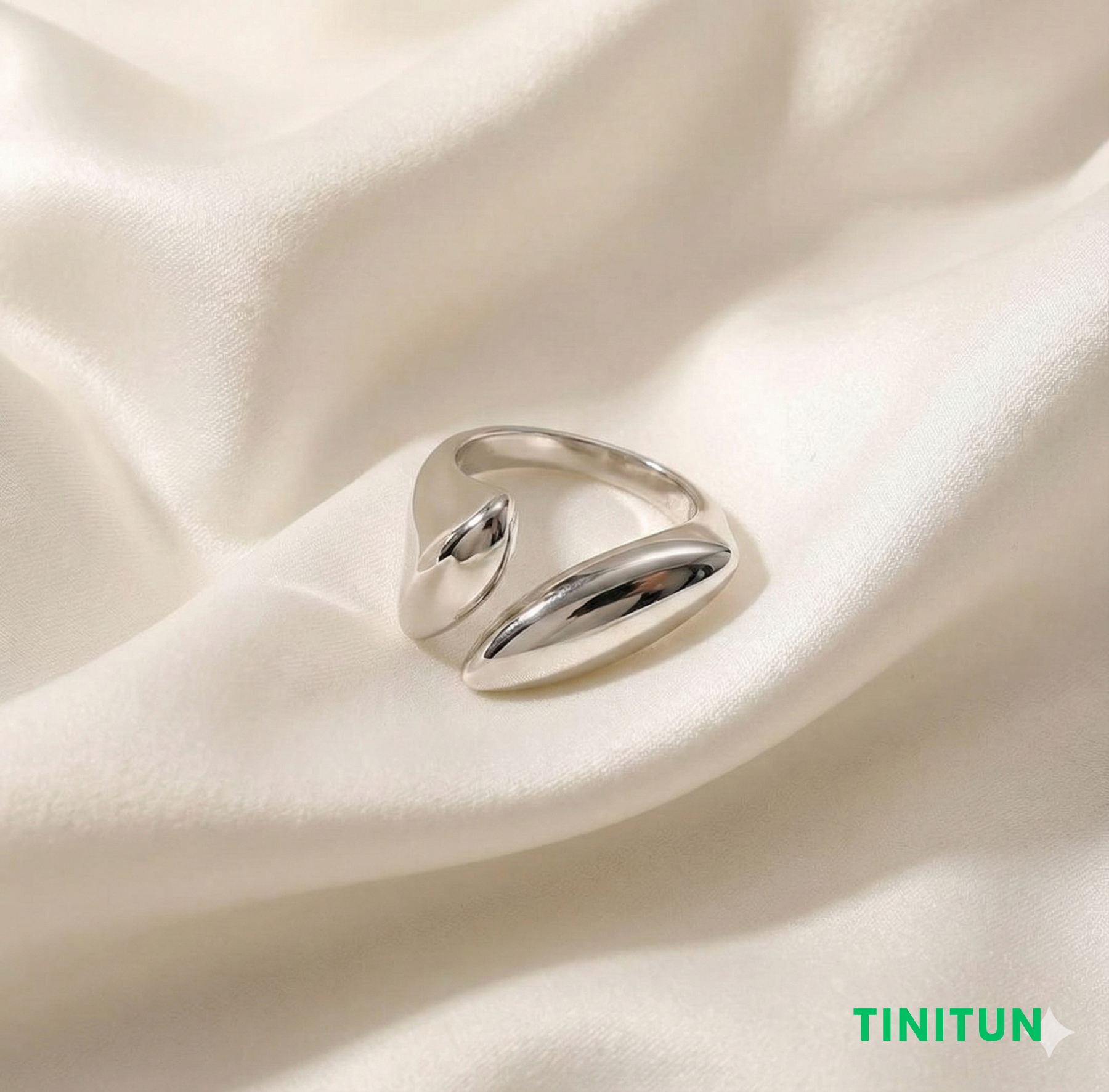 Ця відкрита каблучка сріблястого кольору — втілення сучасної елегантності.